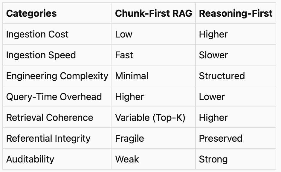 The table below provides clear contrasts between traditional RAG and reason-first architecture: